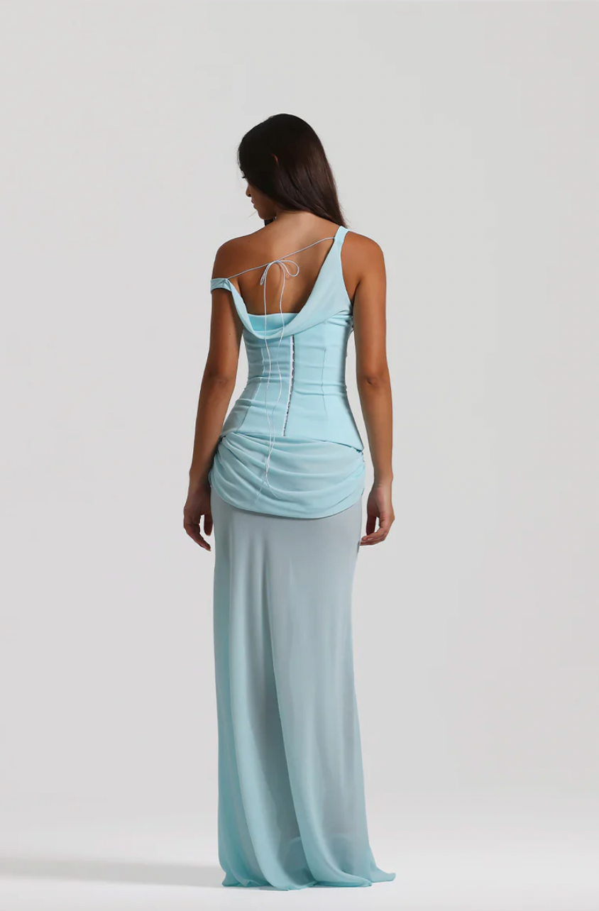 ⋒ Asymmetrical off shoulder draping, under bust support.