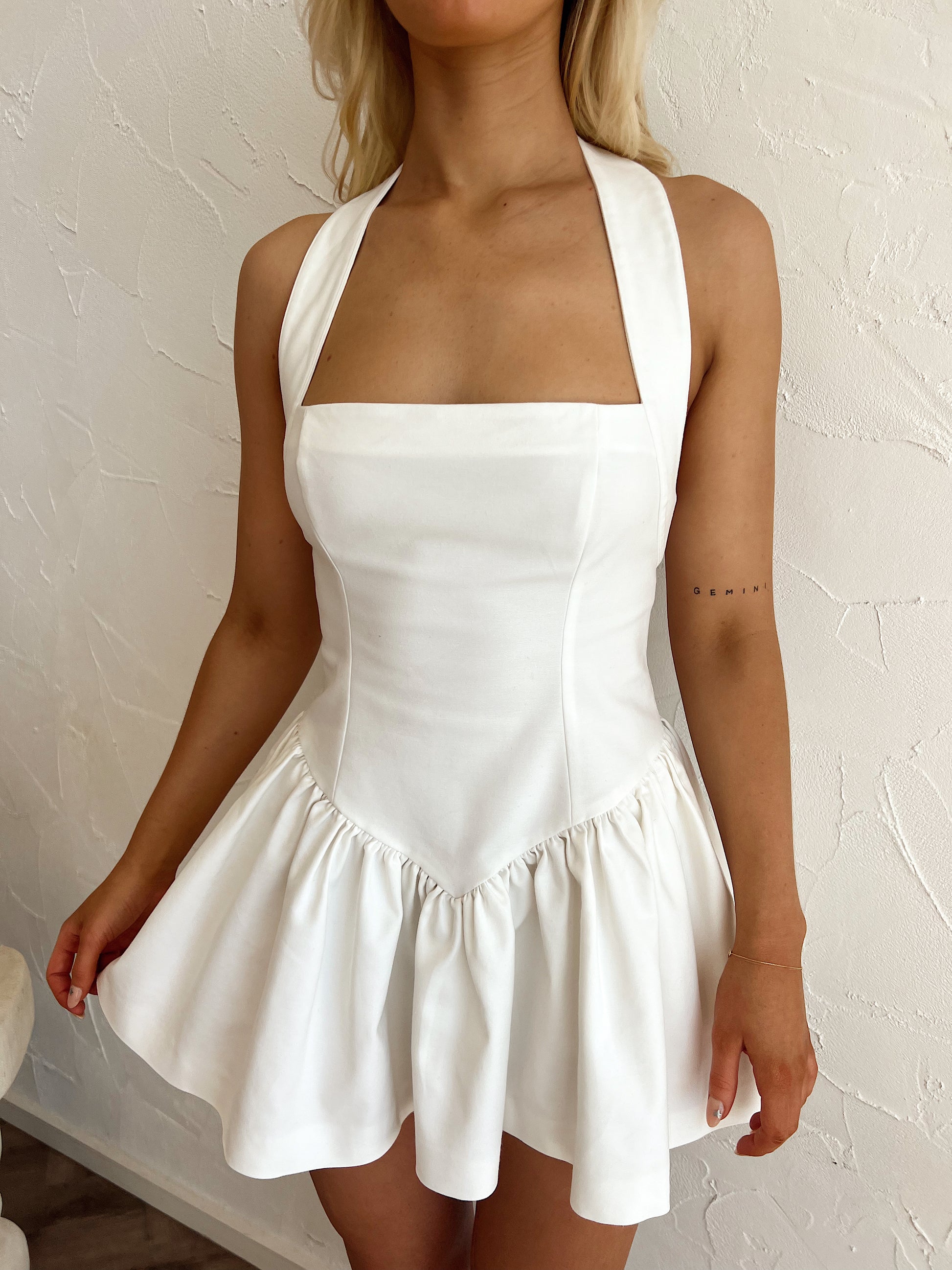 ⋒ Strapless bra friendly, halter neck with button closure, side pockets, invisible zip.