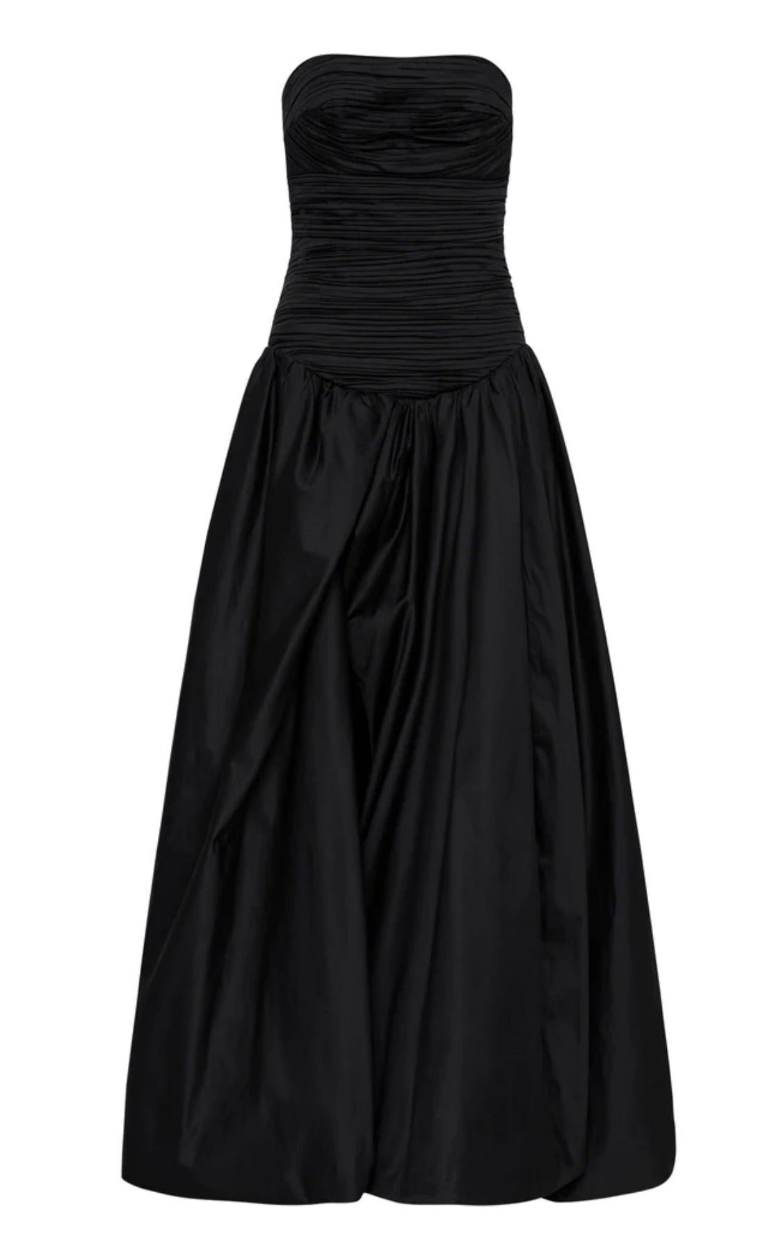 ⋒ Strapless, fitted, ruched bodice, bubble skirt with side split, .